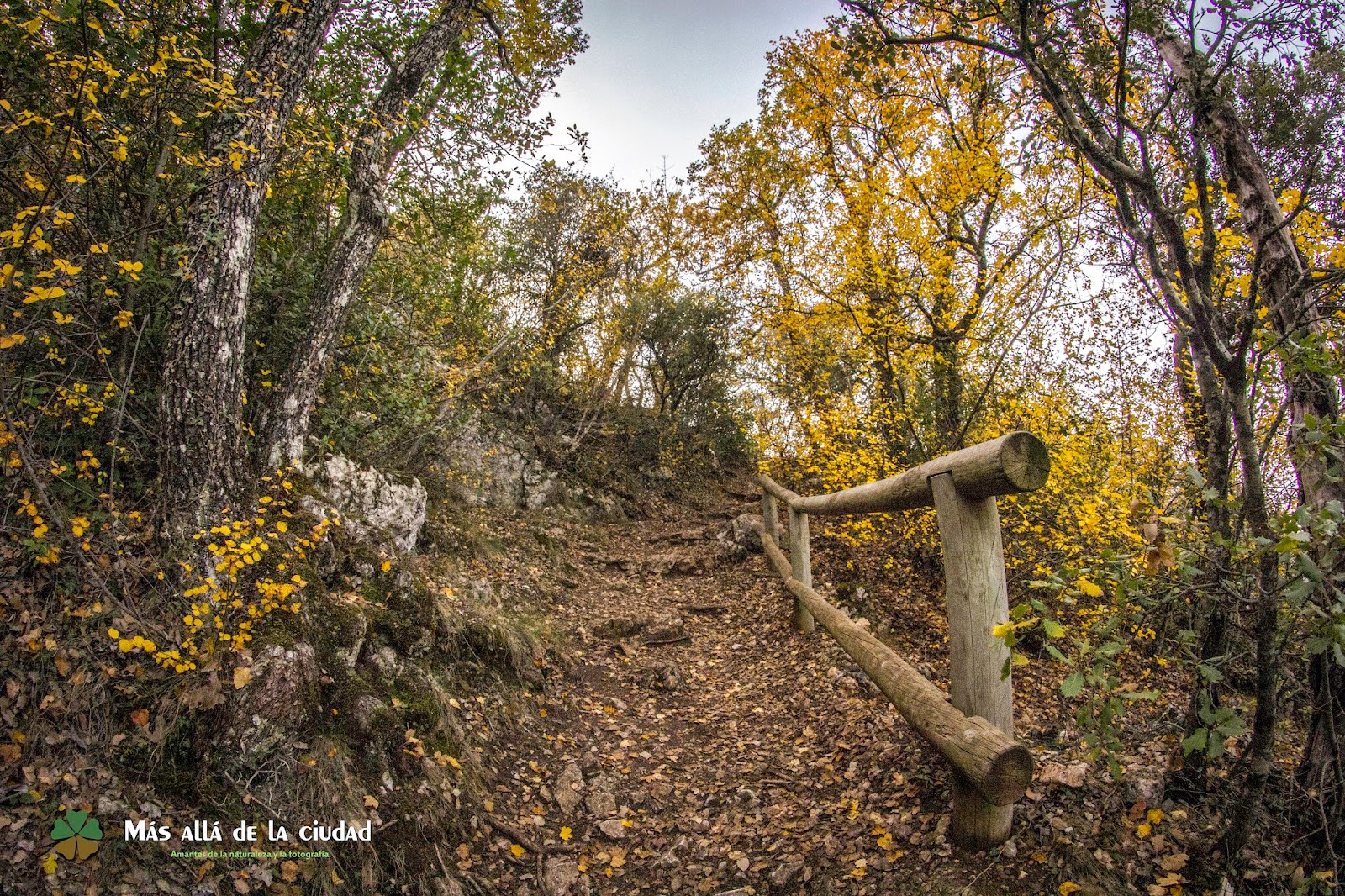 Se trata de una senda que discurre por en medio del bosque de carrascas y que nos va a permitir disfrutar de los colores de los arces, los fresnos y demás árboles caducifolios que colorean el bosque. Aunque vamos ascendiendo rápidamente, la senda no se hace dura y se puede hacer con niños y perros (que te los encontrarás a montones si vas en fin de semana).