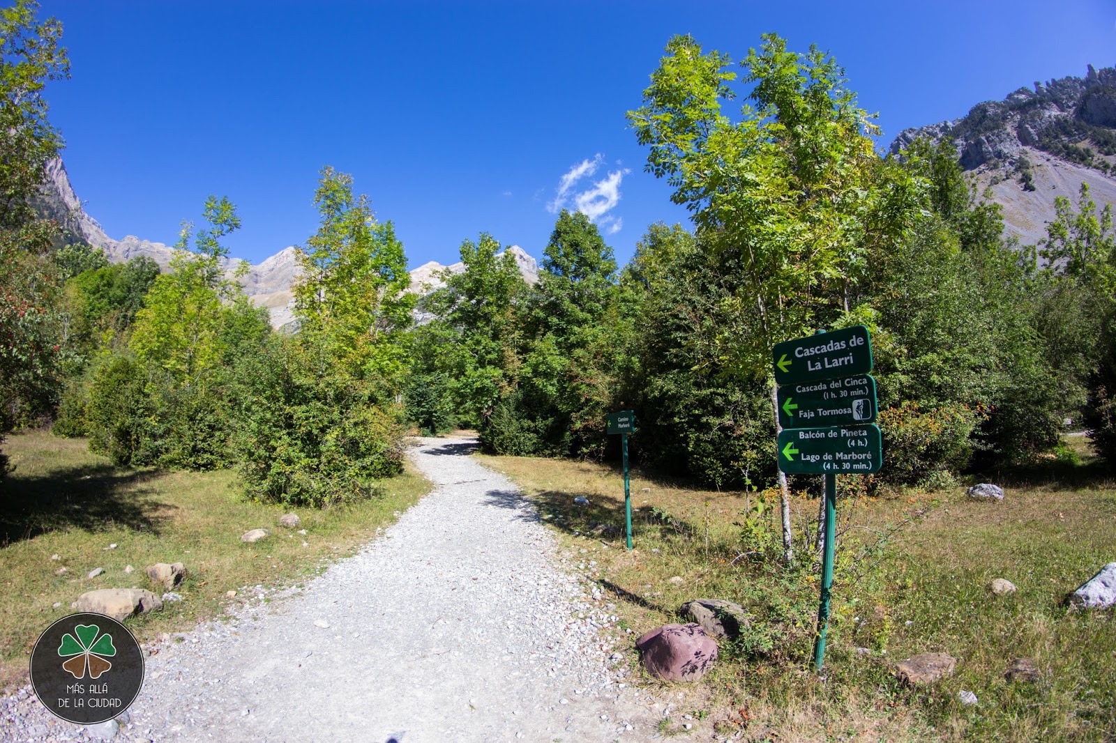 Si seguimos el Camino de Marboré, es decir, el camino más fácil para subir, nos adentraremos en el bosque e iremos ascendiendo ligeramente hasta llegar a la pista forestal. En este punto nos dirigimos a la derecha, dirección Llanos de La Larri. Llegaremos a un puente sobre las cascadas y seguimos nuestro camino. A partir de aquí, no hay pérdida.