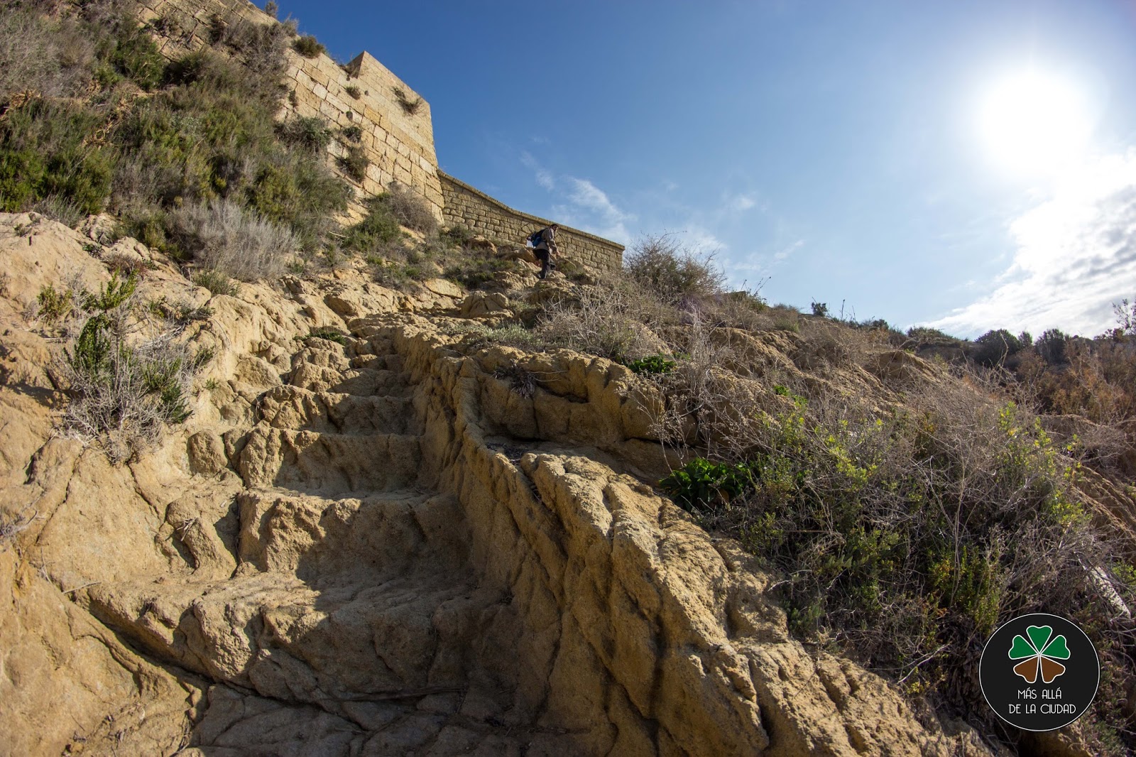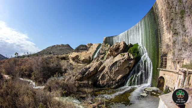 Pronto llegaremos a un edificio antiguo rodeado de palmeras y eucaliptos. Un oasis en medio de este secarral ilicitano se abre ante nosotros. Ya se oye el agua caer, rebosando casi por completo la presa en arco (dependiendo la época del año baja más o menos agua).