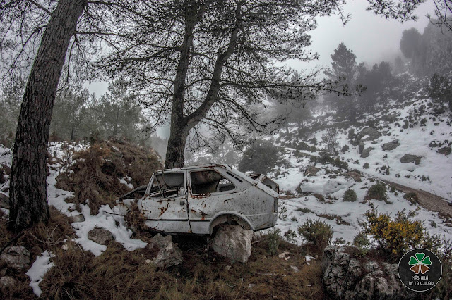 La humedad hace acto de presencia y empezamos a no ver más allá de 3 pinos y la nieve empieza a cubrir cada vez más el suelo. Seguiremos serpenteado entre las grandes paredes del barranco y un bosque de pinos (zona reforestada hace muchos años) hasta llegar a una pista forestal. Justo donde encontramos un Seat de hace muchísimos años bajo un pino abandonado. Una de las sorpresas de la ruta (ya no si estás leyendo esto y aún no has ido).