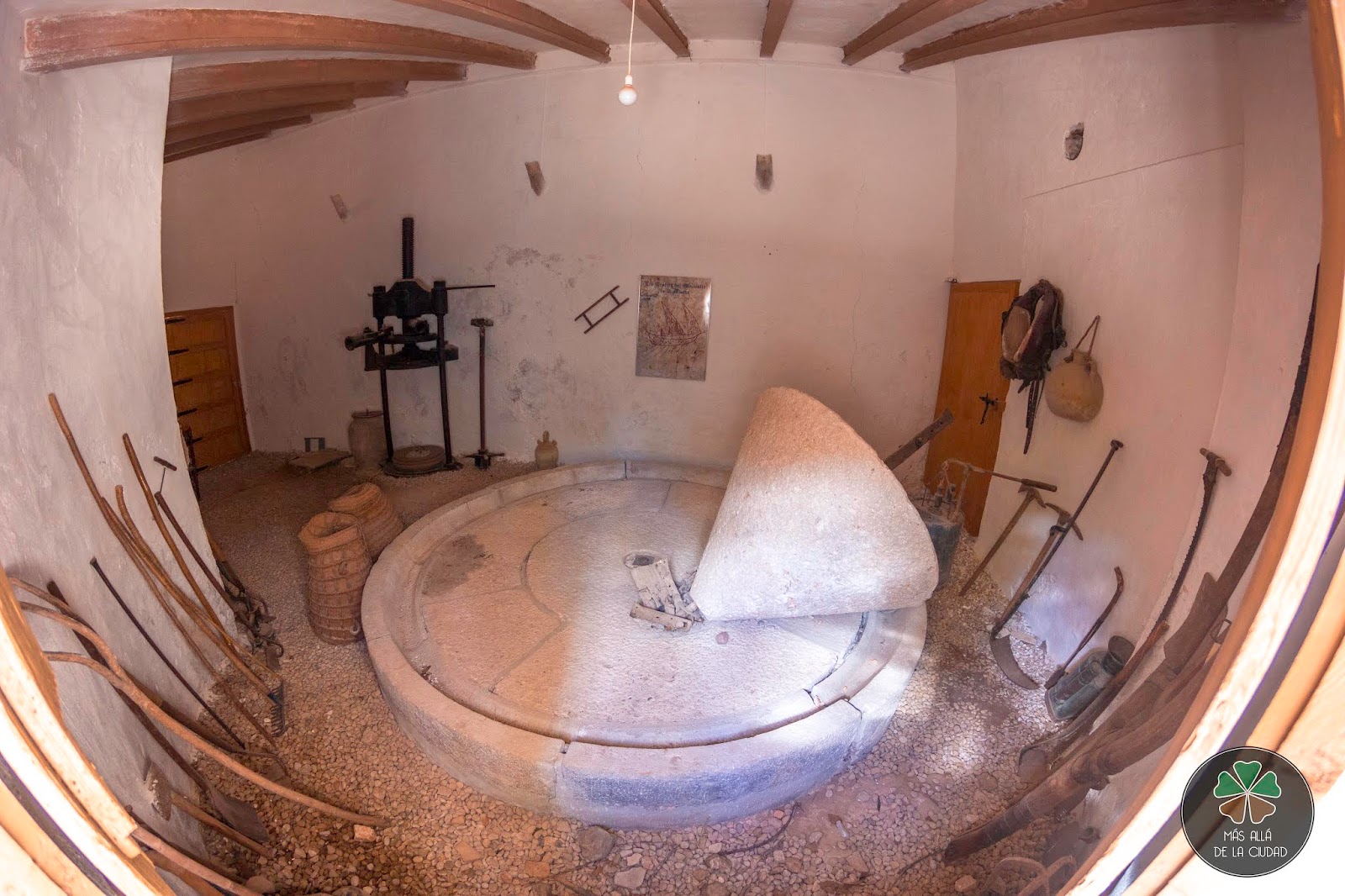 | Vistas al interior de la Almazara (una prensa de aceite que utilizaba tracción animal para mover la gran piedra). |