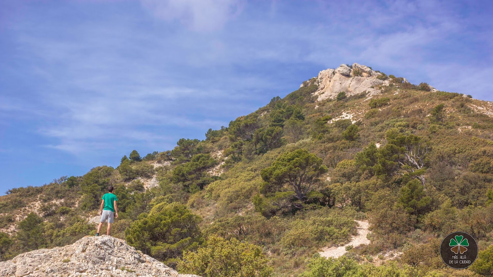 Durante todo el camino, que no tiene mucha pérdida, verás unas marcas con spray verde, que son las que tienes que seguir para llegar arriba. Sin embargo, justo antes de llegar a la cima, situada en unas grandes rocas, el camino se pierde un poco y tienes que ir un poco guiándote por el instinto (yo justo vi a alguien bajar) o por el GPS, ya que tienes que trepar.